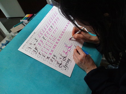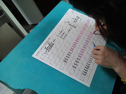 アルファベットを一文字ずつお手本を見ながらしっかり練習していきます |
