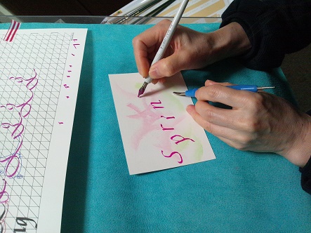 パステルで下絵を作ったら、Springの文字を春が踊り出す様なイメージで楽しく書いていきます