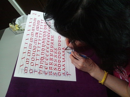 アンシャル体は文字の高さが低く初心者向けですが、初めての挑戦で苦戦しています。